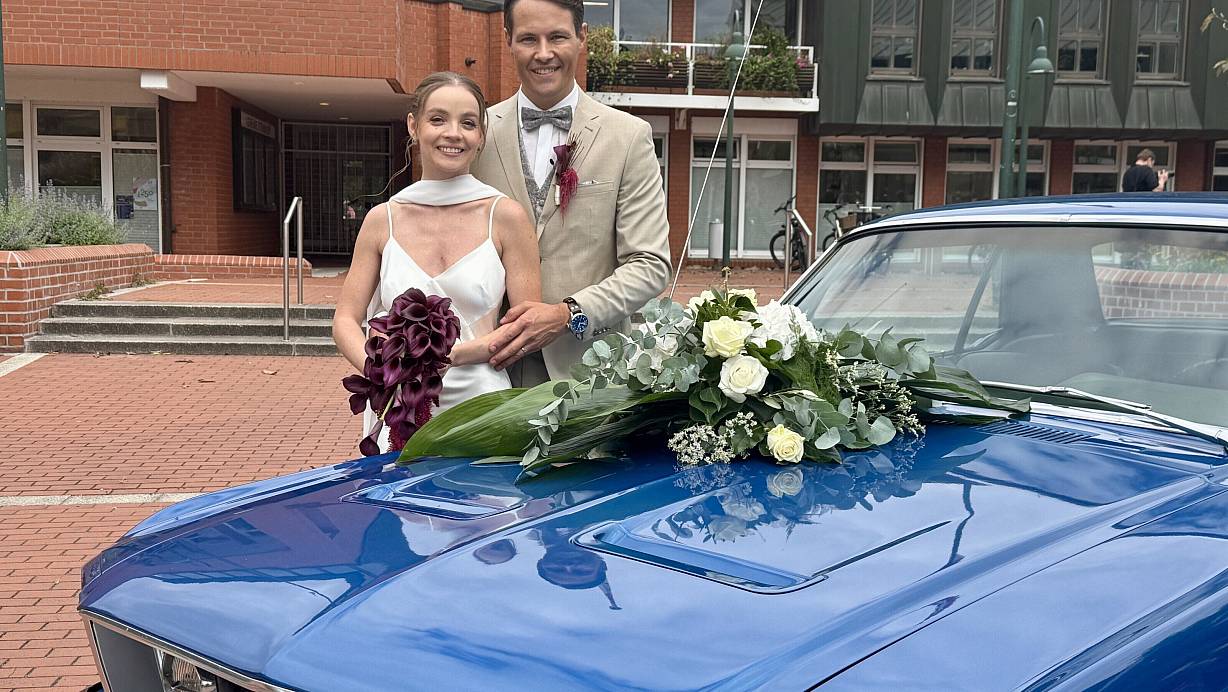 Hochzeit in Steinhagen: Blauer Mustang steht nach der Trauung bereit