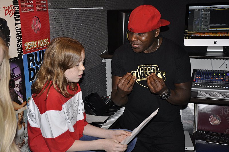 Versmold. „You gotta feel it, keine Angst", ermutigt Dave Taye die Schülerin Lilly Keisinger und dreht den Bass auf Anschlag. Die Siebtklässlerin ist eine von vier Gütersloher Schülern, die mit Taye dieser Tage einen Song produzieren dürfen. Im Rahmen eines Songtext-Wettbewerbes haben die Jugendlichen der Janusz-Korczak-Gesamtschule ihre Ideen zu Papier gebracht. Dem Workshop folgte ein Gesangstraining für die Finalisten und am gestrigen Freitag nun das Einsingen im Tonstudio in Loxten.