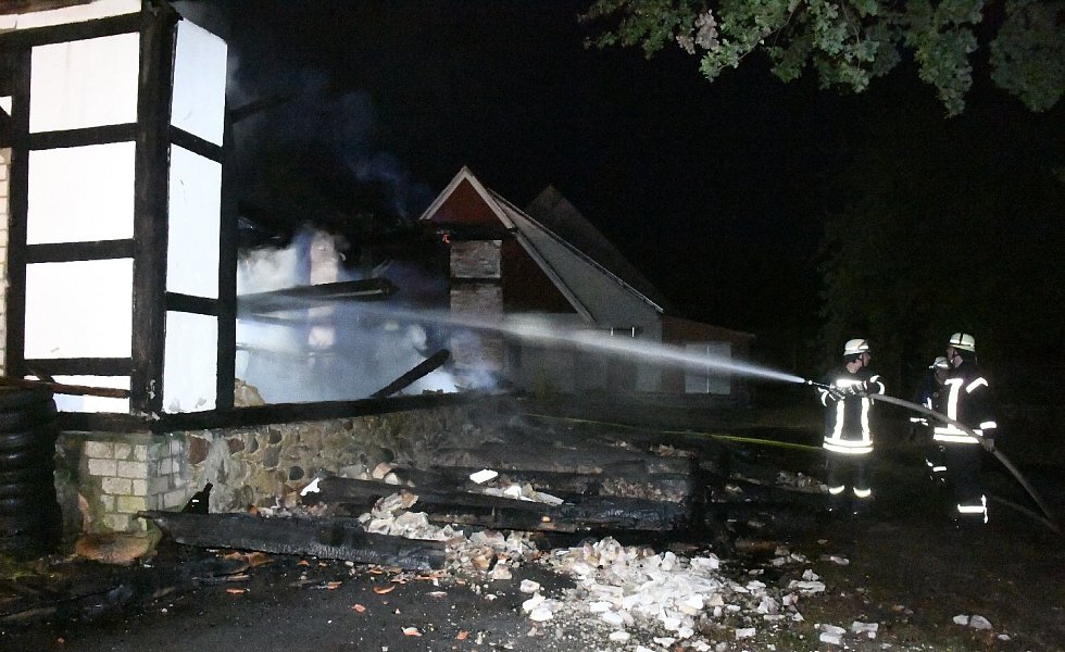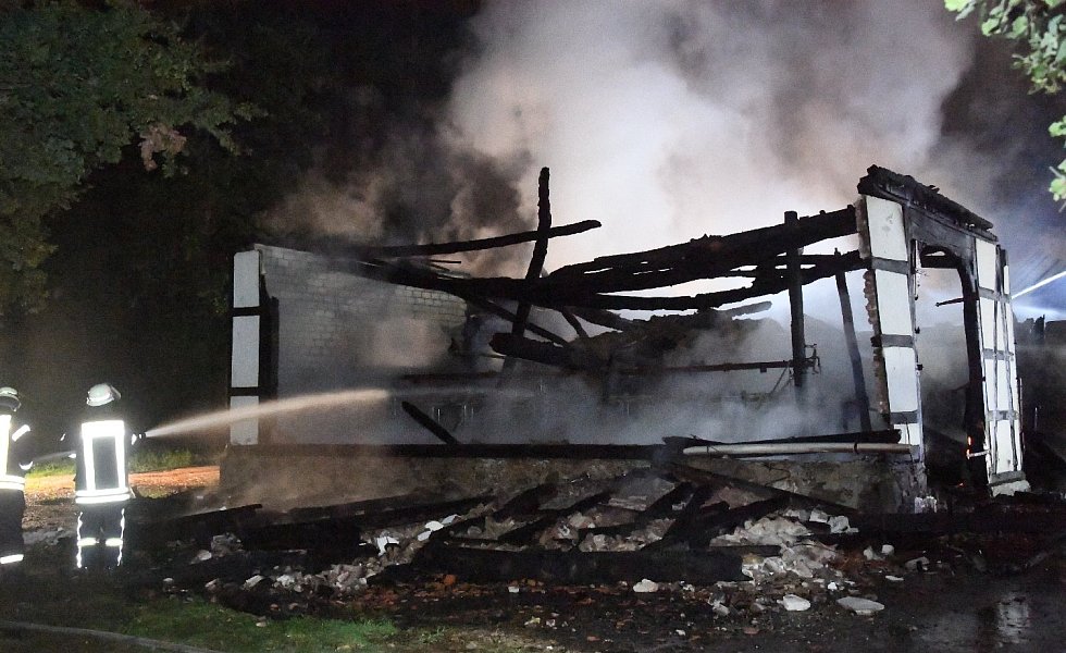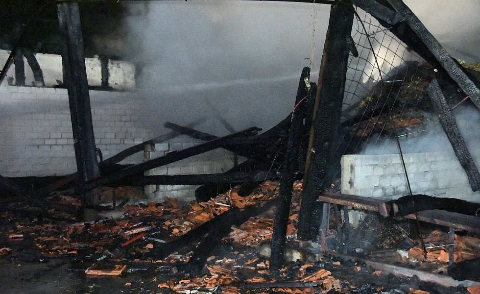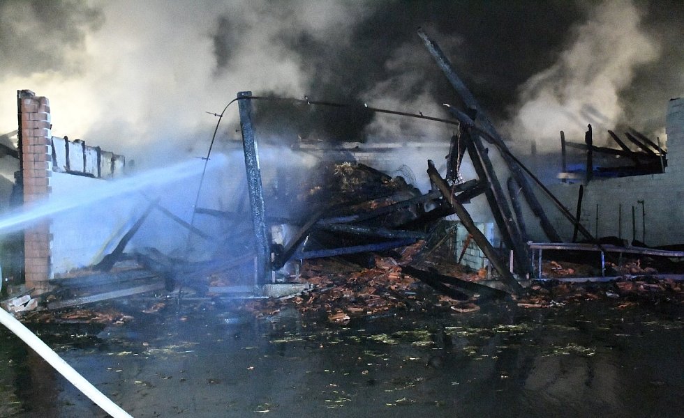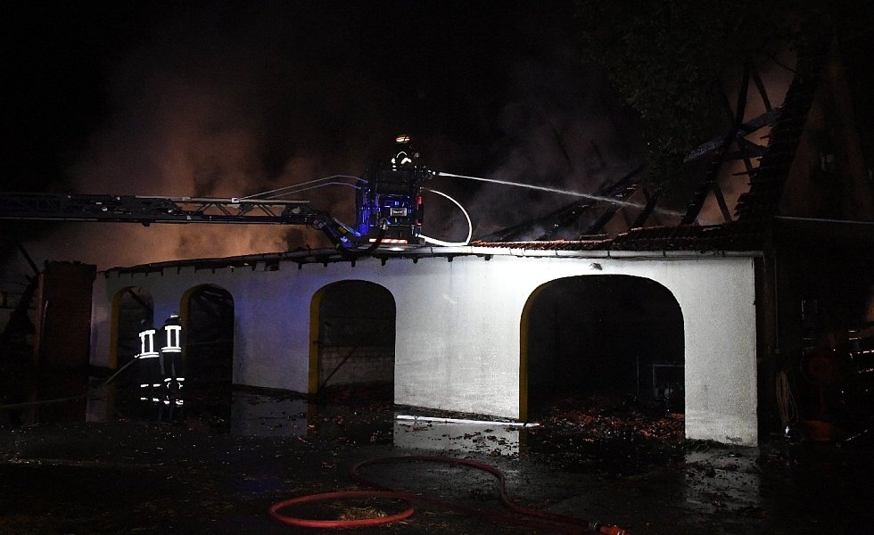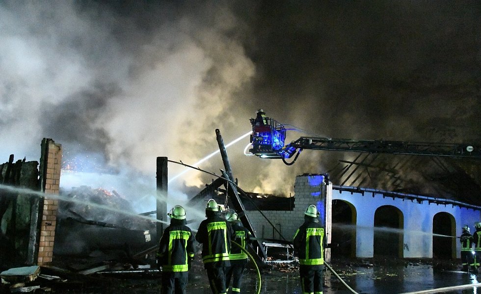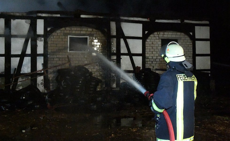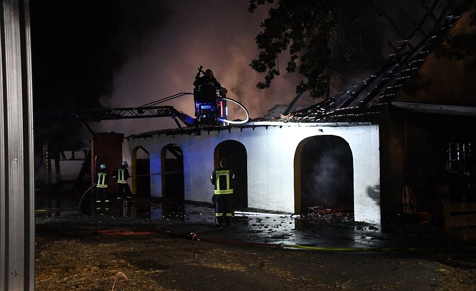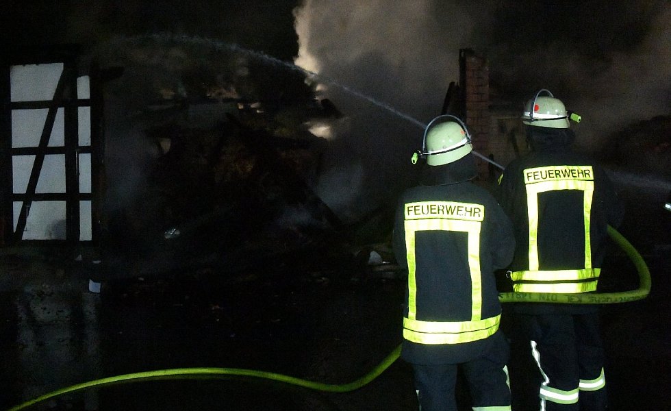 Offenbar hatte der Brand aber schon lange Zeit gewütet, ehe er entdeckt worden war. „Als wir hier eintrafen, stürzten Teile des Daches bereits ein, berichtete Fuest. Von allen Seiten wurde der Brand in der etwa 40 Meter langen und zehn Meter tiefen Scheune bekämpft.