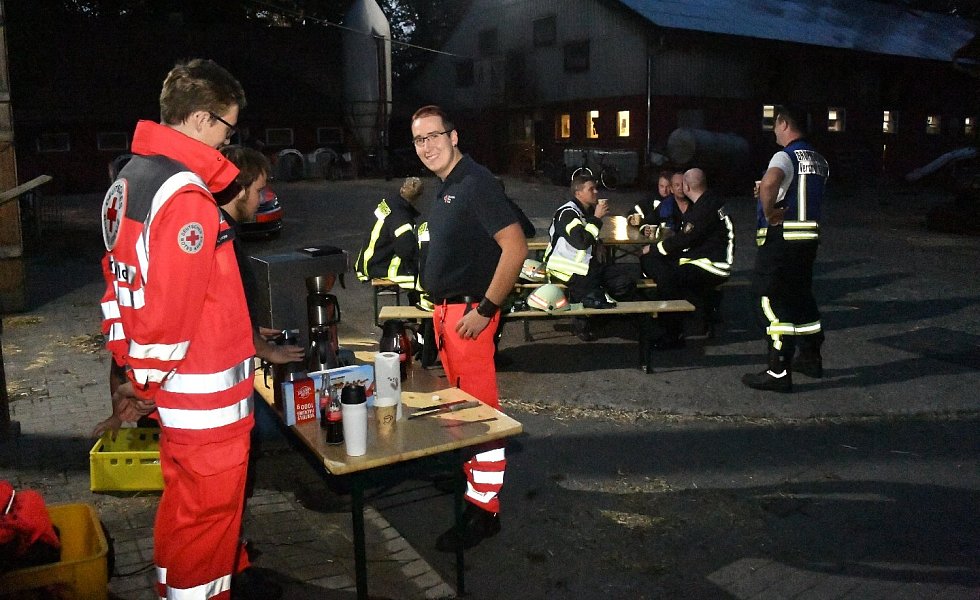 Bis in die Morgenstunden waren die Feuerwehrleute mit den Nachlöscharbeiten beschäftigt. Mitarbeiter des Deutschen Roten Kreuz (DRK) versorgten die Einsatzkräfte mit Kaffee und Brötchen.