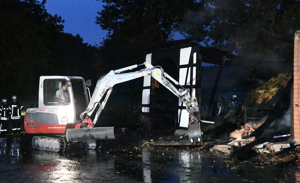 Viel zu retten gab es aber trotz des massiven Einsatzes für die Feuerwehrleute nicht. Ein Bagger wurde später bestellt, mit dessen Hilfe letzte Glutnester abgelöscht wurden. Der Bagger nahm die Einzelteile des eingestürzten Dachstuhles auseinander, letzte Glutnester konnten dann schnell abgelöscht und das Holz separat gelagert werden.