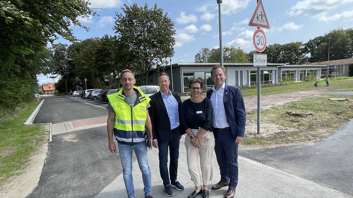 Versmold. Von der Baustelle selbst hat die Schulgemeinschaft kaum etwas mitbekommen, vom Ergebnis profitieren alle. Die Sommerferien wurden genutzt, um den Eschkamp vor der Grundschule Bockhorst verkehrssicherer zu machen. Gerade einmal einen Monat haben die Arbeiten gedauert und sind damit voll im Zeitplan geblieben. Entsprechend zufrieden ist man seitens der Stadt und der Schulleitung. „Für die Hol- und Bringsituation ist das eine deutliche Entspannung“, sagt die kommissarische Schulleiterin Ingeborg Johanning. Gleichzeitig wurde die Parksituation fürs Kollegium verbessert und die Querung für Rad fahrende Kinder erleichtert.