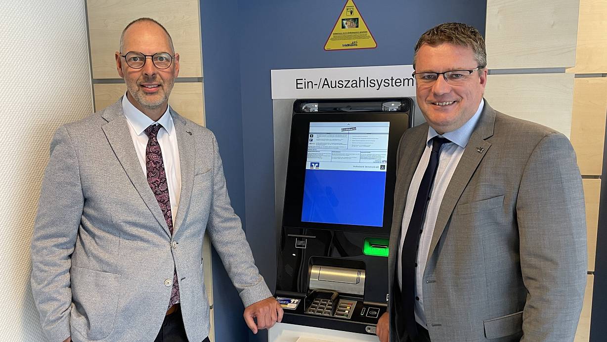 Volksbank-Chef Jens Wagemann (l.) und Stefan Kirchhoff vom Vorstand - hier im SB-Foyer an der Münsterstraße - haben zusammen mit dem Aufsichtsrat intensiv beraten, ob nach der Geldautomatensprengung eine neue Moneybox in Loxten aufgebaut werden soll. | © Tasja Klusmeyer