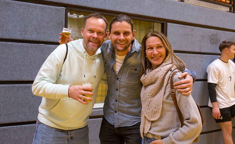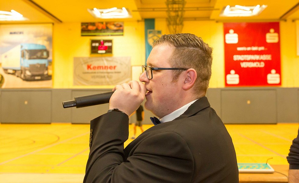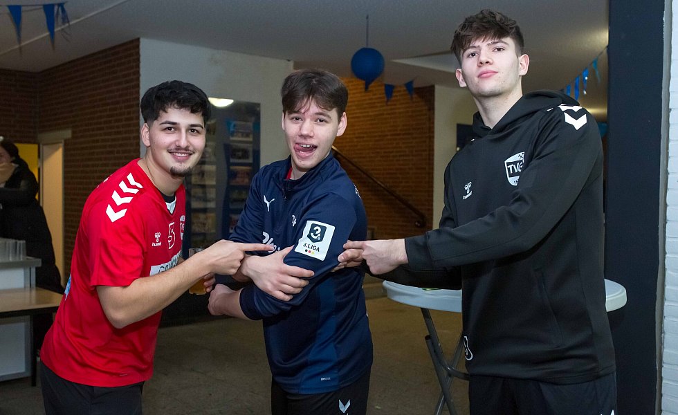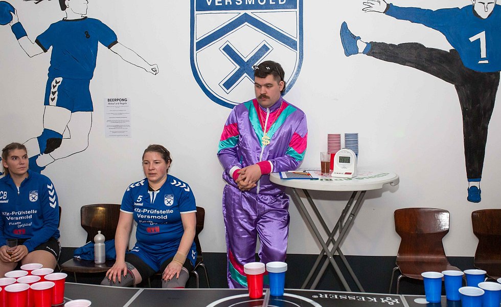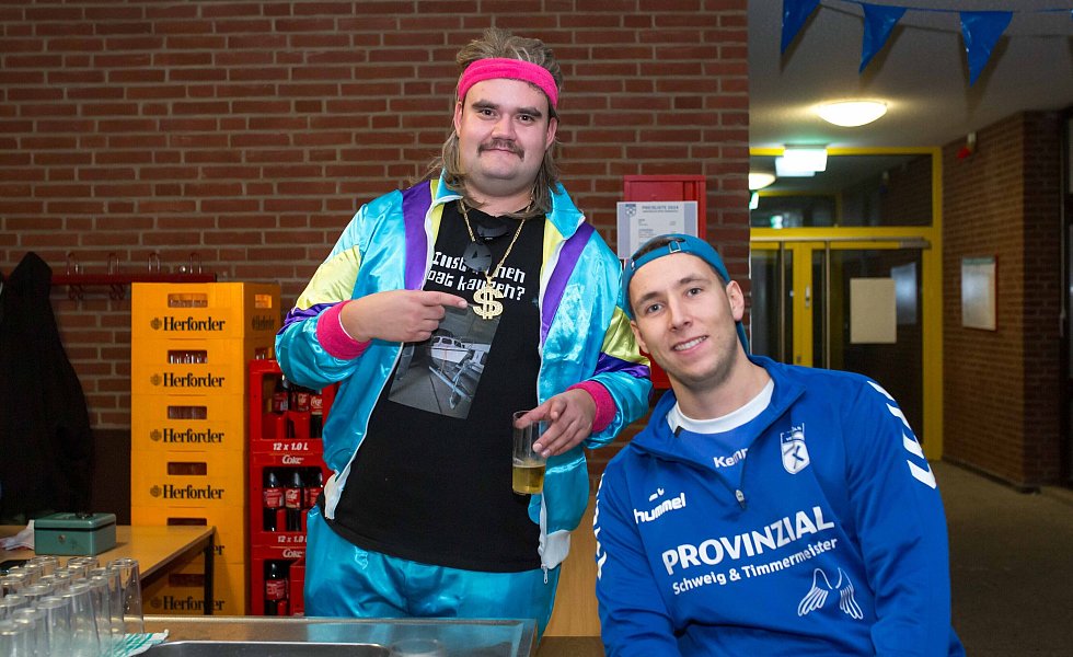 An dem Tisch empfingen Veips und Reinker die Spieler in besonderen Kostümen im „New-Kids-Style.“ Für das skurrile Outfit rasierte sich Sören Veips sogar seinen üppigen Bart ab und passte seine Frisur an. „Wir hatten im vergangenen Jahr schon lustige Weihnachtsanzüge. Wir wollten damit einfach ein bisschen herausstechen“, sagte Veips. Ein echter Hingucker für die vielen Sport- und Spaßfans in der Versmolder Dreifachhalle.