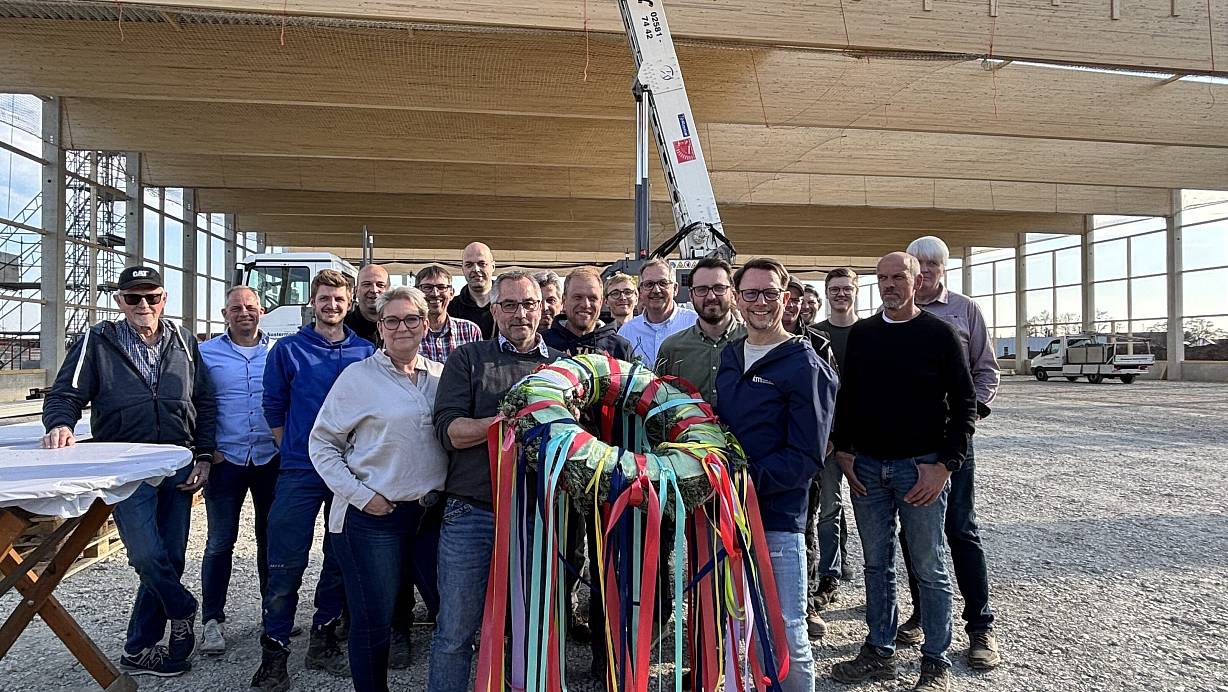 Architekt Mirko Moch (vorne r.) und Unternehmer Fred Seidel zusammen mit Ehefrau Petra Seidel halten gemeinsam den Richtkranz. Mit dabei sind die am Neubau beteiligten Betriebe. Die Dimension der neuen Lagerhalle ist anhand der mächtigen Holzbalken gut zu erkennen. | © Tasja Klusmeyer