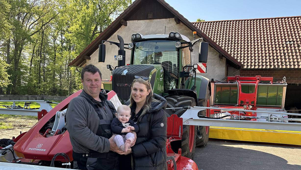 Mehr Tierschutz bei der Mahd: Martin Stratmann und Kristina Daum mit Tochter Lilli am modernen Mähwerk des Herstellers Pöttinger, in das sie als Agrarlohnunternehmer im Versmolder Ortsteil Loxten nun investiert haben. | © Tasja Klusmeyer