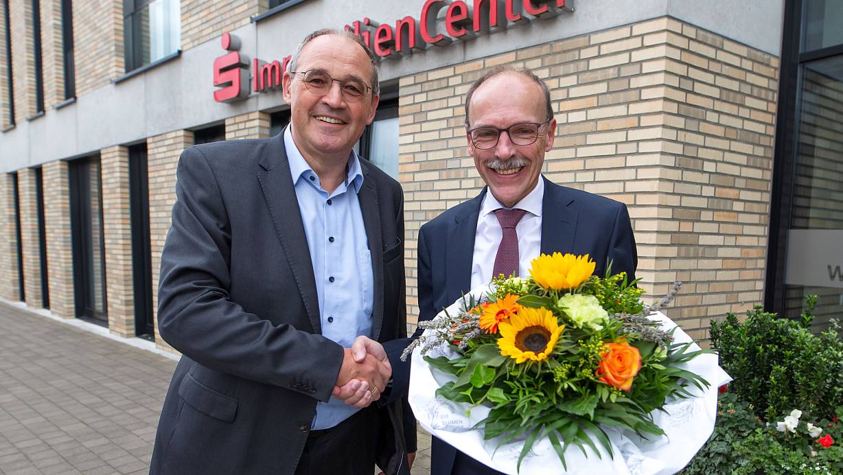 Sparkassen-Chef Gerold Momann (l.) gratuliert Dietrich Krumkühler zu seinem äußerst seltenem Dienstjubiläum. | © Andre Schneider