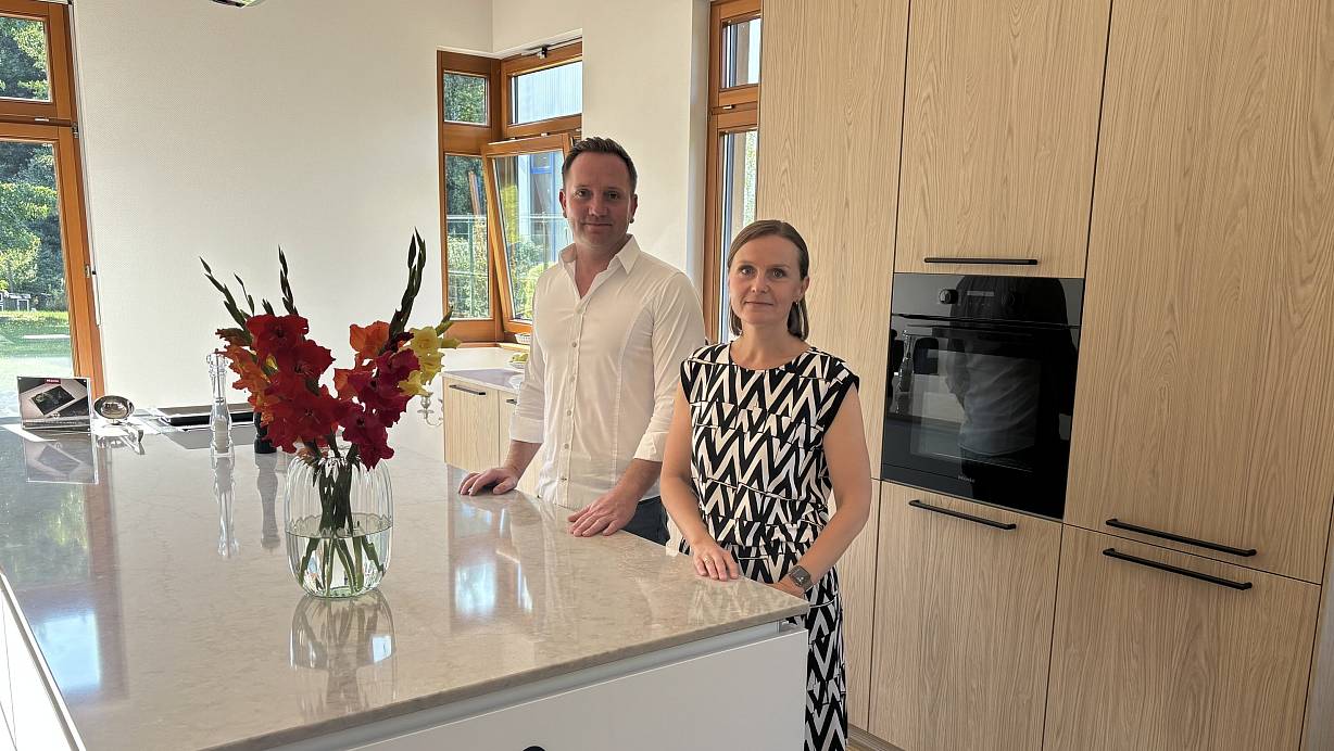 Küchenstudio-Inhaber Vladimir Voronzov und seine Schwägerin Olga Voronzov, die im Backoffice im Unternehmen tätig ist, in einer der neuen Musterküchen. Am neuen Standort hat das Versmolder Unternehmen nun mehr Platz. | © Tasja Klusmeyer