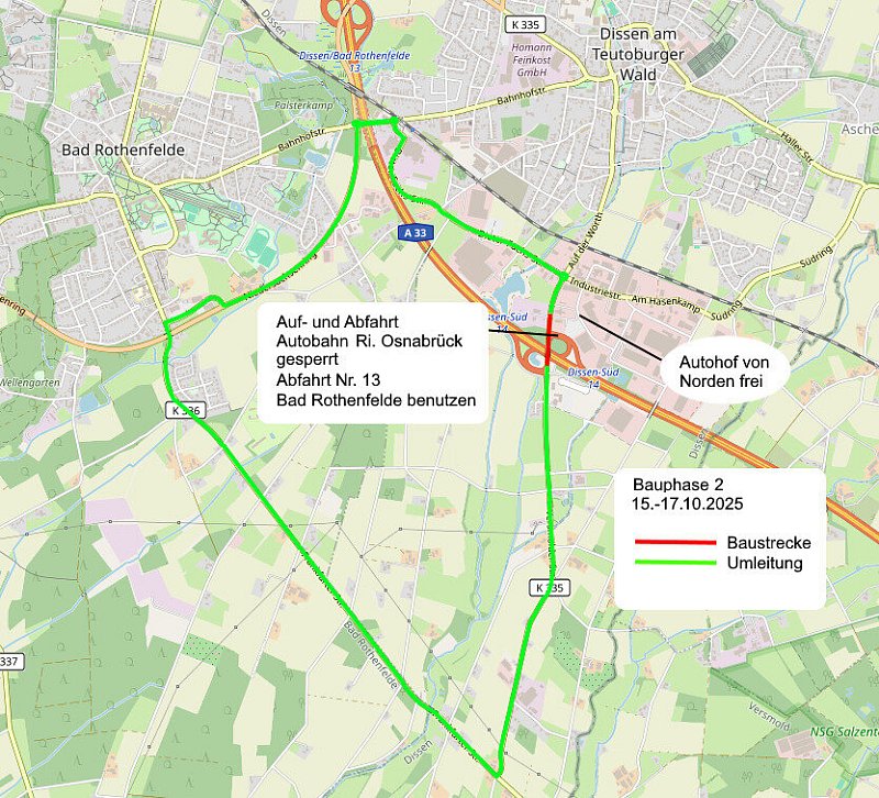 „Währenddessen sollte die Ausfahrt Nummer 13 „Dissen/Bad Rothenfelde“ genutzt werden, empfiehlt der Landkreis Osnabrück. Entsprechend verläuft die großräumige Umleitung über den Niedersachsenring vorbei an Bad Rothenfelde über die Frankfurter Straße Richtung Bockhorst (und in gegengesetzte Richtung). Für Verkehrsteilnehmer aus Versmold kommt zudem die Anschlussstelle Borgholzhausen infrage.