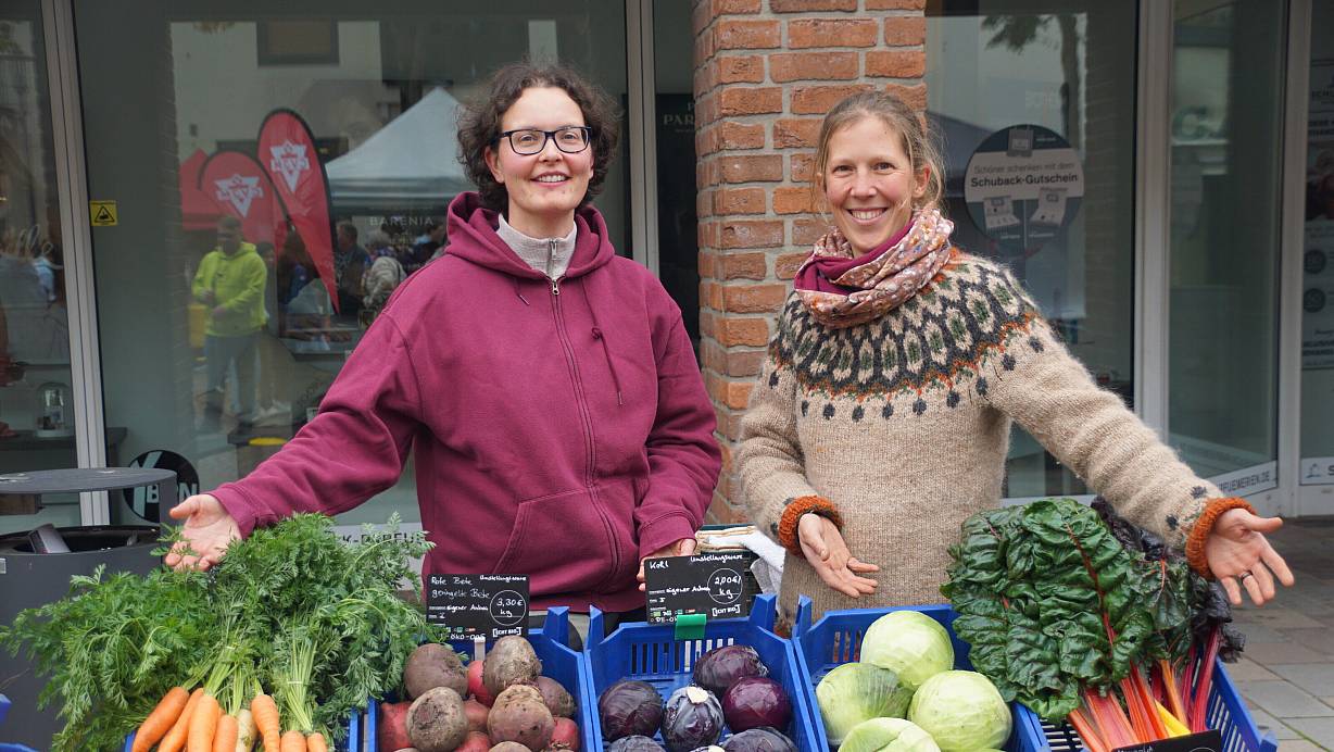 Sandra Blome (Bio-Gärtnei Blome) und Lena Zeitzen (Zeitzens Grünzeug) haben sich einen Gemüse- und Obststand geteilt. | © Marion Bulla