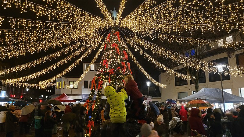 Immer am Montag nach Totensonntag lädt die Stadt zu Geselligkeit und ein bisschen Programm auf den Marktplatz ein. Der Countdown, den Bürgermeister Michael Meyer-Hermann zusammen mit den Gästen zählt, hat inzwischen gute Tradition. Bei null angekommen, geht schließlich das Licht in Versmolds guter Stube an und „Ah“- und „Oh“-Rufe sind angesichts des Lichtglanzes zu hören. Etwas weiter auf dem Rathausplatz findet sich der zweite Hingucker: der XL-Adventskranz am Brunnen.