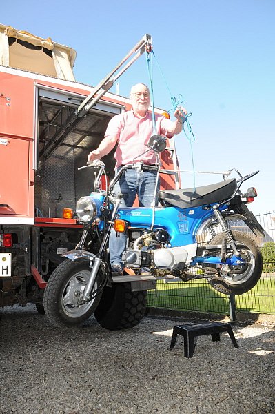 „Man will ja die Gegend erkunden, wenn man angekommen ist." Damit er seinen fahrbaren Untersatz nicht von Hand hinein- und wieder herauswuchten muss, hat sich Michael Fels einen Flaschenzug gebaut. Flugs das Motorrad drangehängt, hochgezogen – schon kann es in die Ladefläche geschoben werden.