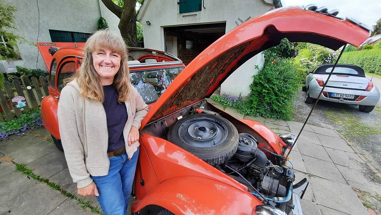 Heike Hoffmann kaufte ihren Citroën 2CV schon in den 1990ern. Seitdem kurvt sie damit durch den Altkreis und halb Europa. Warum die kleine rote Ente in vielerlei Hinsicht eine gute Investition war.
