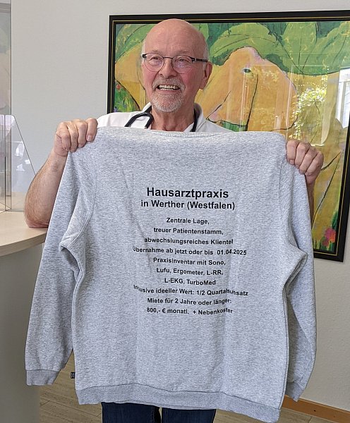 Werther. Wenn es um die Suche nach einem Nachfolger oder einer Nachfolgerin geht, ist Wolfgang Decius um kreative Ideen nicht verlegen. Eigens für die Praxisbörse der Kassenärztlichen Vereinigung jüngst in Bielefeld hat er ein Sweatshirt mit Werbung in eigener Sache drucken lassen. „Hausarztpraxis in Werther“, steht in großen Lettern darauf geschrieben. „Zentrale Lage, treuer Patientenstamm, abwechslungsreiche Klientel, Übernahme ab jetzt oder bis zum 1. April 2025, Praxisinventar mit Sono, Lufu, Ergometer, L-RR, L-EKG, Turbo-Med.“ Und weiter: „Miete für zwei Jahre oder länger: 800 Euro monatlich plus Nebenkosten.“