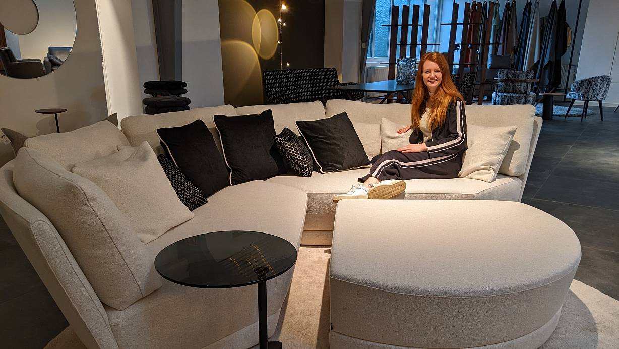 Probesitzen gefällig? Juniorchefin Lea Oberwelland tut genau dies auf dem herrlich bequemen Lounge-Sofa der Reihe "Trick" mit einer Fußablage, die sich wie ein Tortenstück in die Sitzelemente hineinschieben lässt. | © Anja Hanneforth