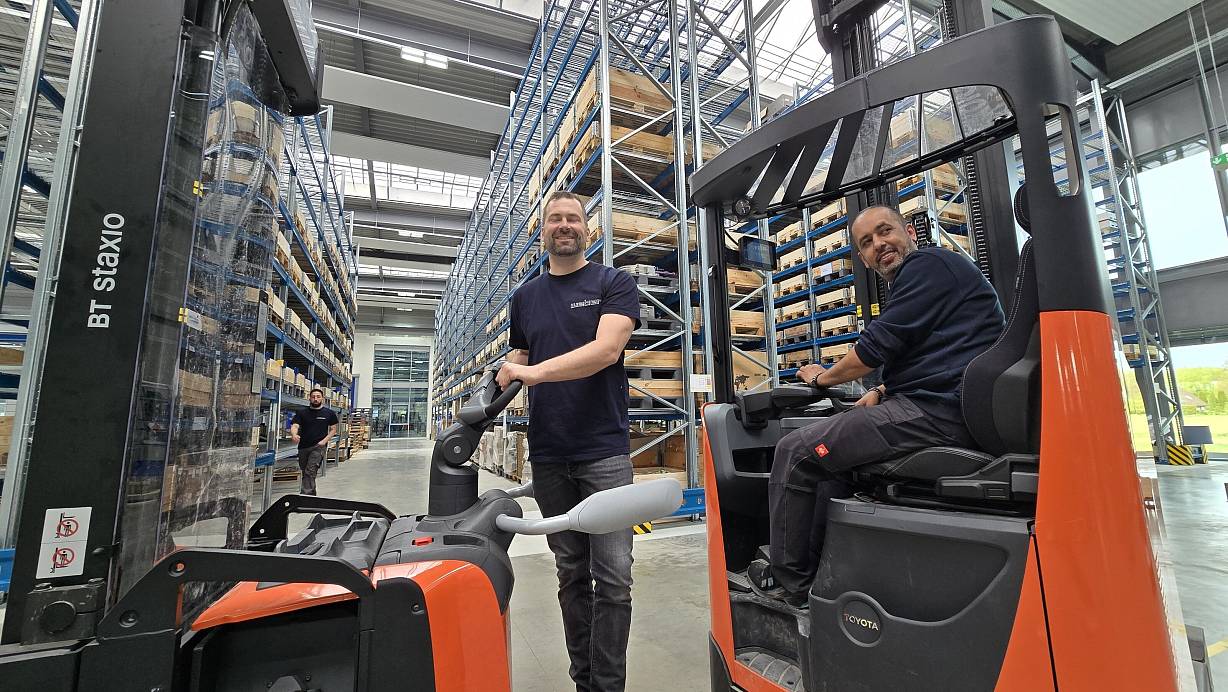 Das Hochregallager hat sich dank des Umbaus maßgeblich erweitert. Leiter Simon Rösler (l.) und Ahmed Arslan füllen die Palettenplätze bis zu einer Höhe von neun Metern. | © Silke Derkum-Homburg