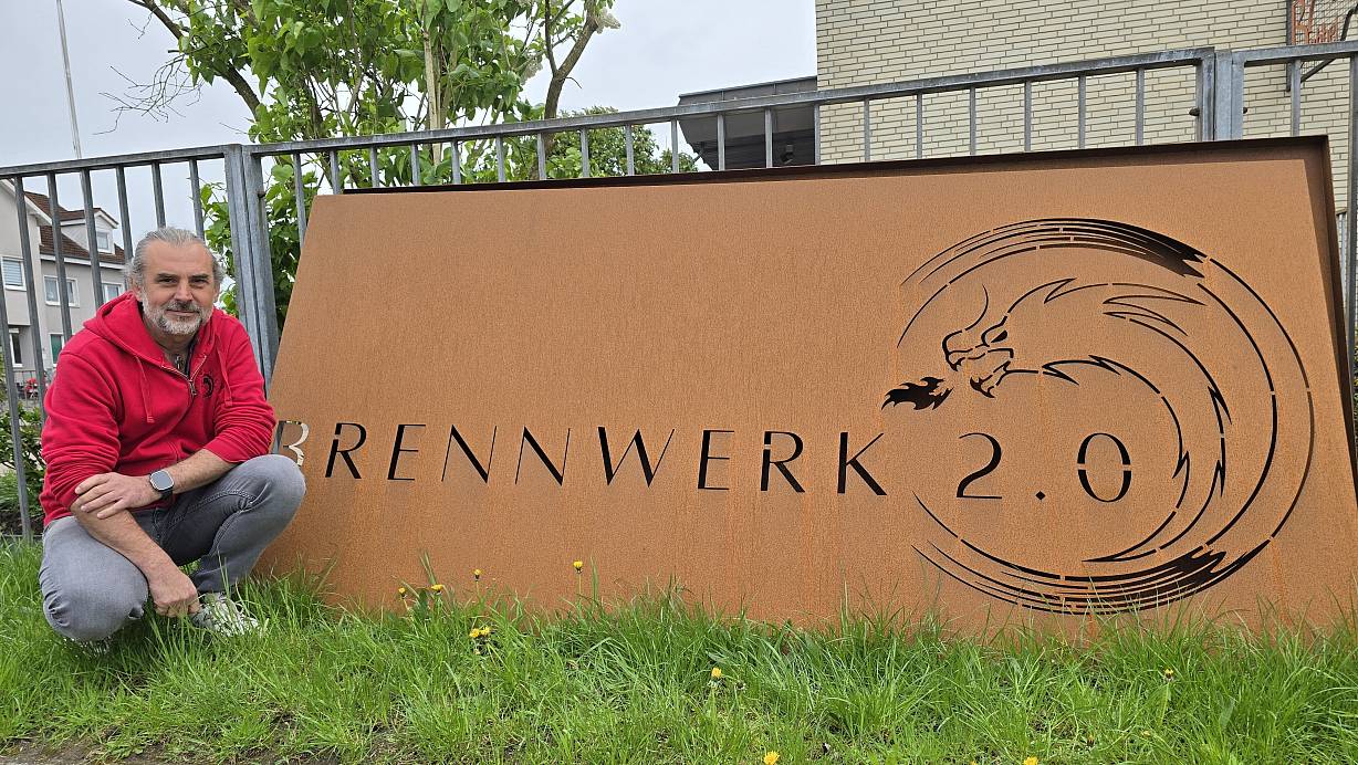Jonas Jungmann hat sich mit seiner Firma Brennwerk 2.0 auf die Herstellung von Feuertonnen spezialisiert. Das riesige Firmenschild aus Stahl soll bald an der Halle prangen. | © Silke Derkum-Homburg