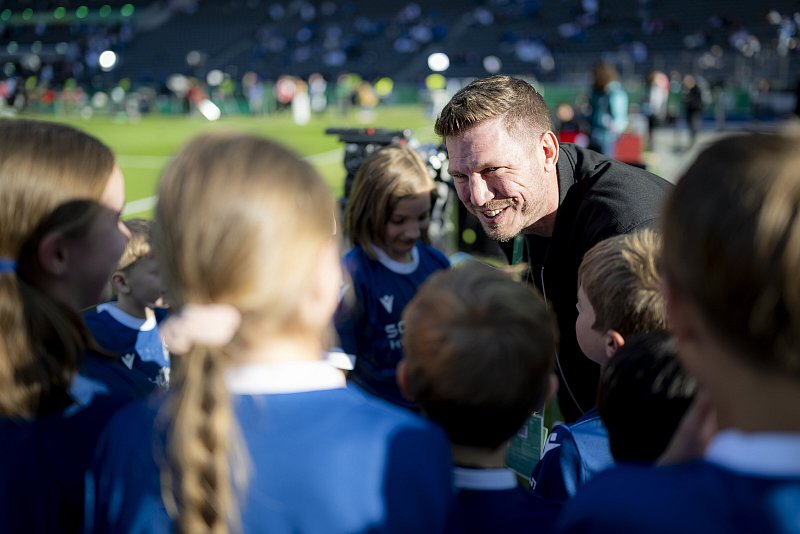 Arminia-Legende Fabian Klos macht Joshua und den Einlaufkindern Mut