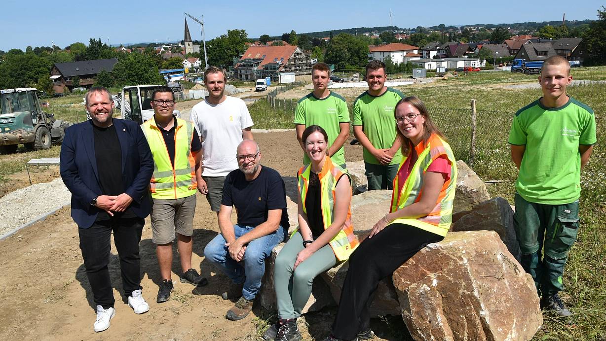 Bürgermeister Veith Lemmen (v.l.), Rathaus-Mitarbeiter Lars Dilba, Michel Steffen vom Büro Ermshausen Landschaftsarchitektur, Marco Kaase von Buchalla Landschaftsbau, Rathaus-Mitarbeiterin Sarah Huxohl, Moritz Tiedemann und Julian Busch von Buchalla, Rathaus-Mitarbeiterin Kristin Neuhaus sowie Ben Buchalla auf dem Blotenberg, auf dem das neue Wohnquartier entsteht. | © Birgit Nolte