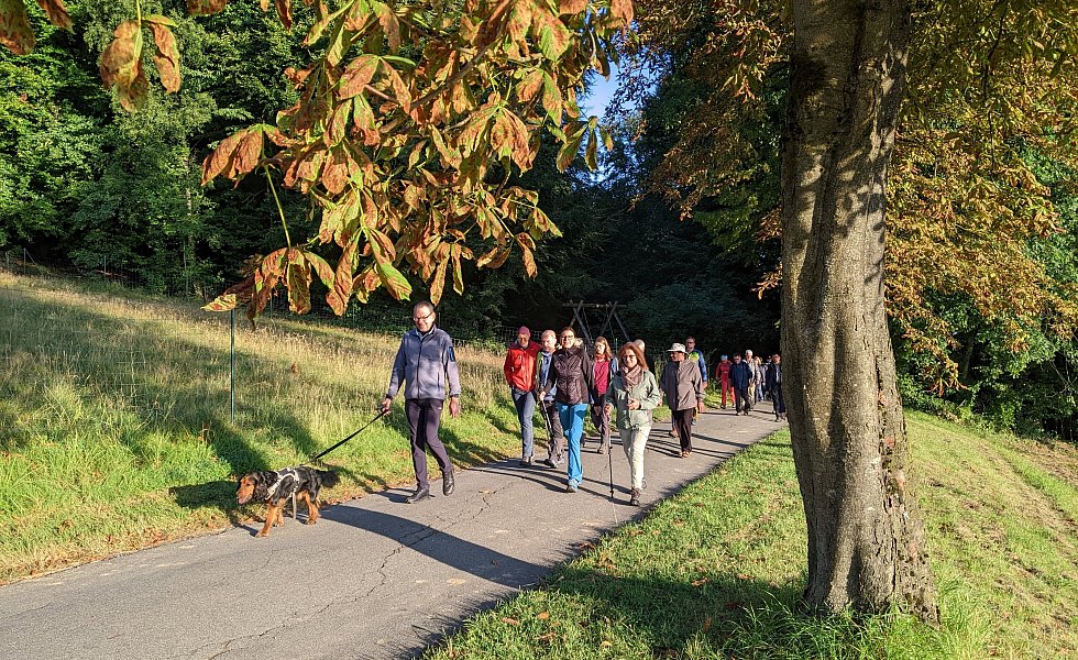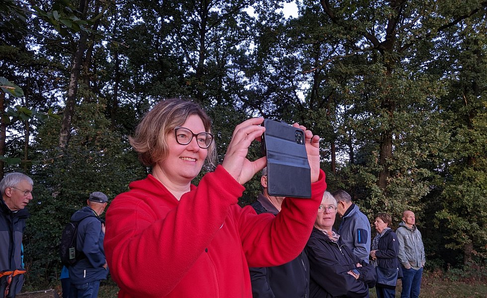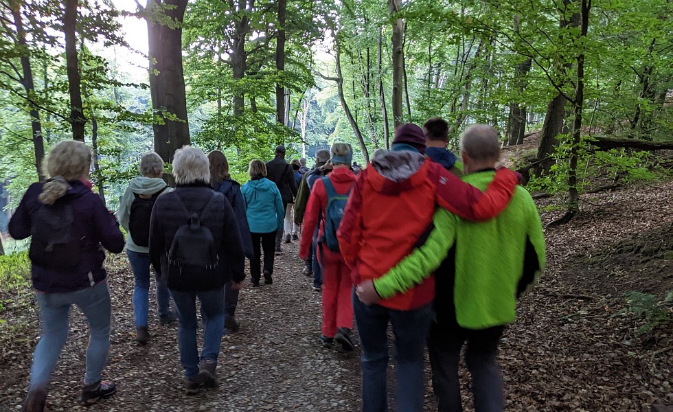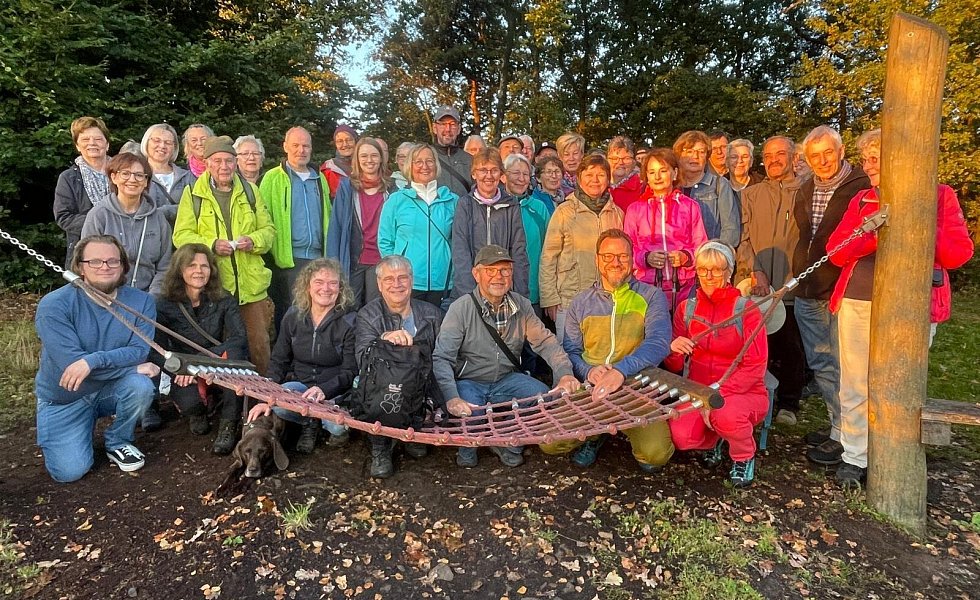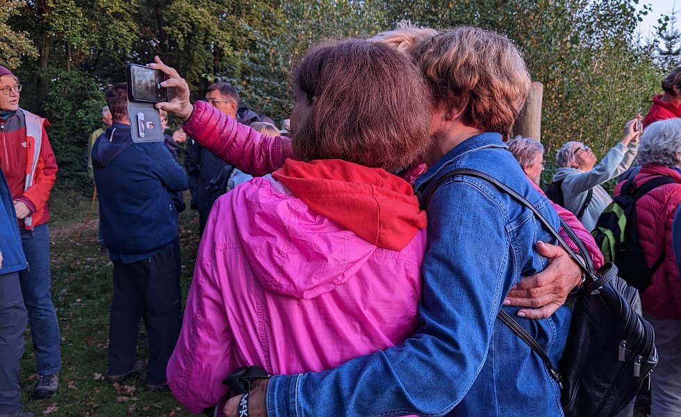 Als ich am Bergfrieden ankomme, sind mehr als 60 Wanderbegeisterte schon da. Wir werden von Organisatorin Sandra Wursthorn von der Stadt, Cornelia Wulfmeier vom Bergfrieden und Wanderführer Klaus Maciejewski begrüßt. „Toll, dass Sie alle gekommen sind!“
