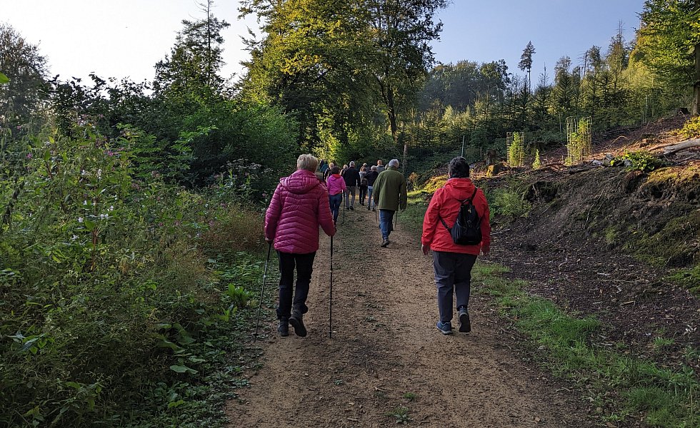 Klaus Maciejewski führt die Gruppe von vorn, Sandra Wursthorn bildet die Nachhut. Es geht ordentlich bergan. Einige beginnen zu schnaufen. Ich auch ein bisschen, genieße aber den wunderbaren Duft des Waldes. Und die Aussicht über Isingdorf, als die erste unbewaldete Fläche vor uns liegt. „Ganz schön viele Kahlschläge hier“, fällt auch anderen Wanderern auf, dass kaum noch Fichtenbestände übrig sind. Was ihr Schaden ist, ist allerdings des Wanderers Nutzen: Sonst blieben uns die vielen schönen Ausblicke verborgen.