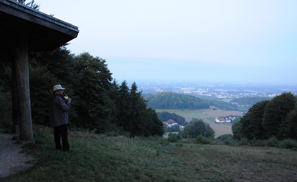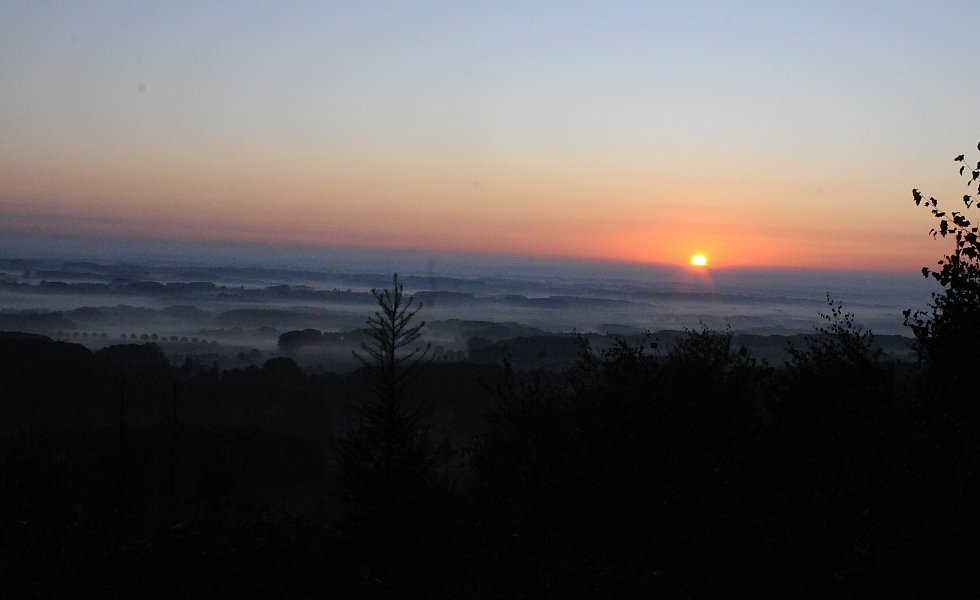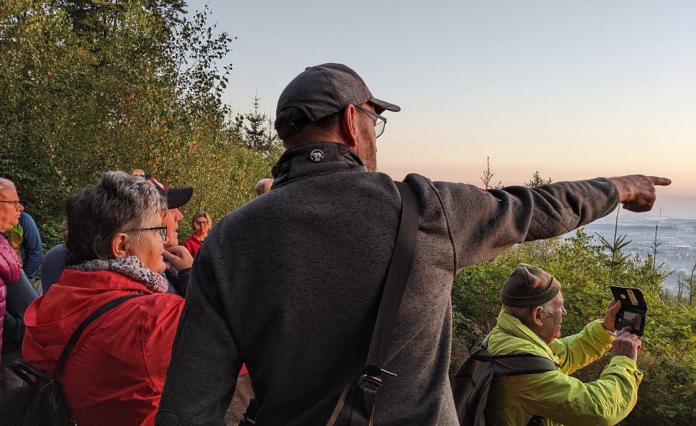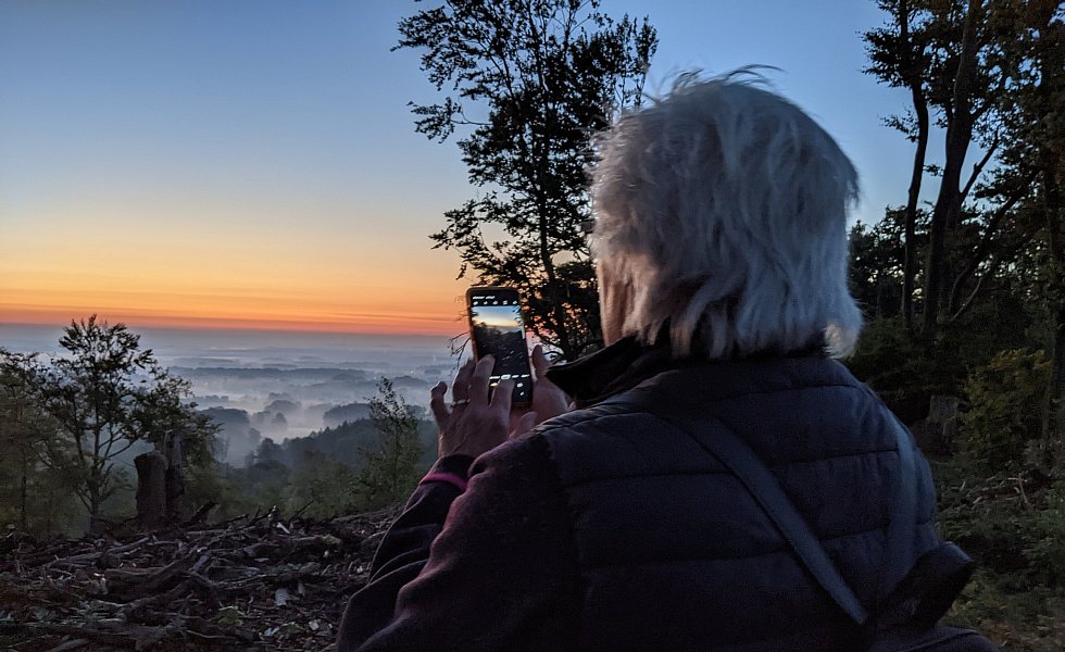 Wir wandern los. Müssen wir auch, verkündet Klaus Maciejewski, denn die Sonne geht um 6.46 Uhr auf. Wenn wir den schönsten Blick vom Teuto aus haben wollen, ist Trödeln nicht angezeigt. Glücklicherweise sind einige Wanderer schon zum wiederholten Mal dabei. Sie haben Taschenlampen mitgebracht und leuchten allen anderen den Weg. Denn kaum im Wald, ist von der beginnenden Morgendämmerung nichts mehr zu sehen.