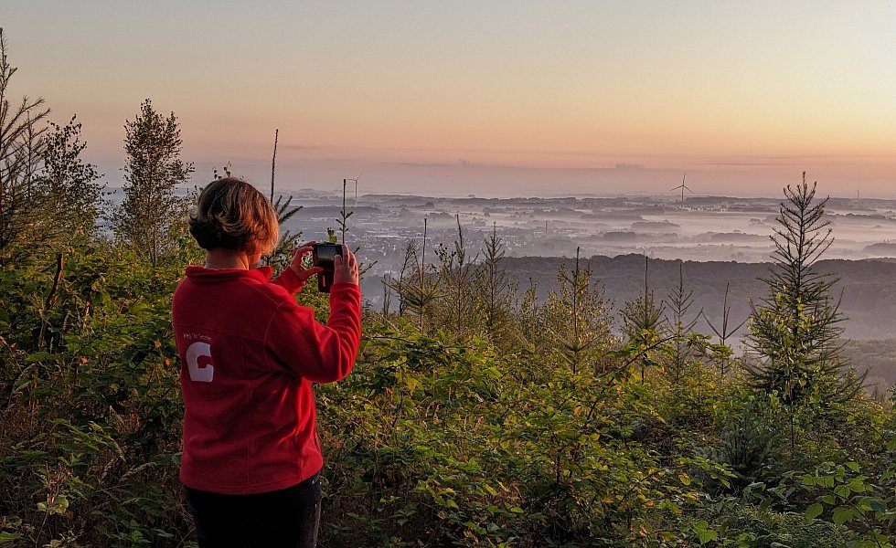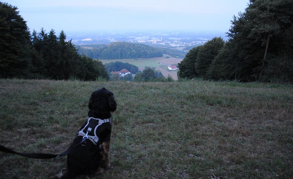 Während sich der Himmel im Osten orange färbt, liegt der Westen noch im Dämmerlicht. Trotzdem halten alle in Höhe der Gleitschirm-Flugschanze in Ascheloh inne und bewundern den Blick über Künsebeck. Cocker Spaniel Monty nimmt erst mal Platz. Ich halte den Moment im Foto fest.
