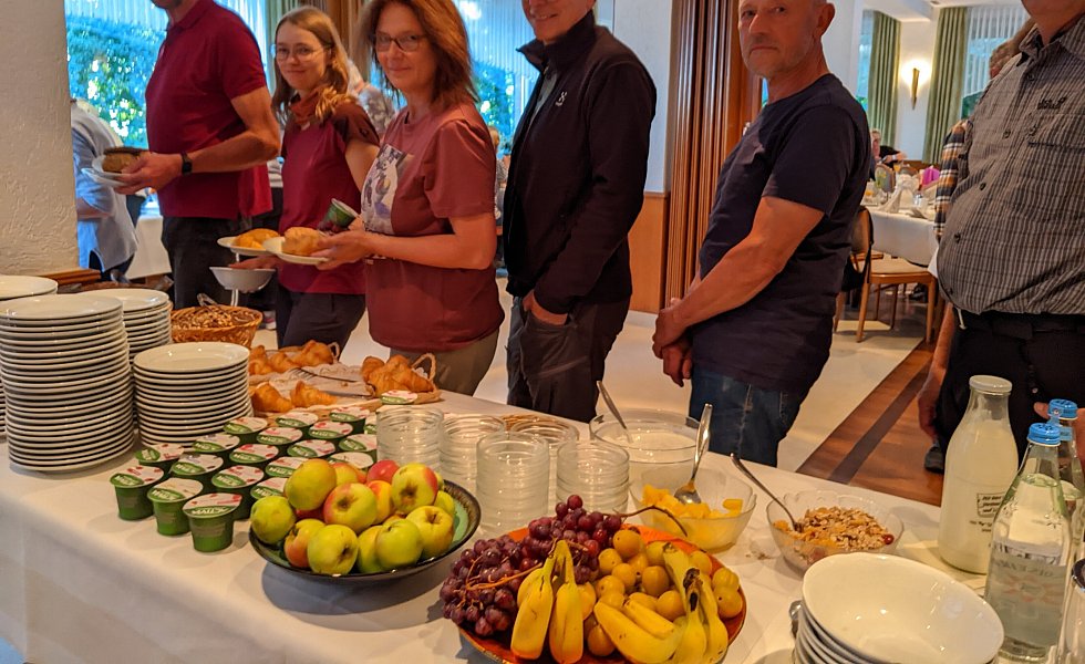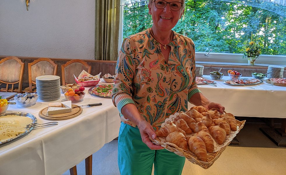 Punktlandung! Wir sind wieder am Bergfrieden angekommen. Es duftet herrlich nach Kaffee und frischen Brötchen. Cornelia Wulfmeier und ihr Team haben ganze Arbeit geleistet und ein köstliches Frühstücksbuffet gezaubert. Es ist der perfekte Abschluss für eine perfekte Wanderung. Und das Tolle: Wer dieses Mal nicht dabei war, hat am 5. September 2026 die Gelegenheit: Für diesen Termin kündigen Cornelia Wulfmeier und Sandra Wursthorn nämlich die elfte Sonnenaufgangswanderung an.