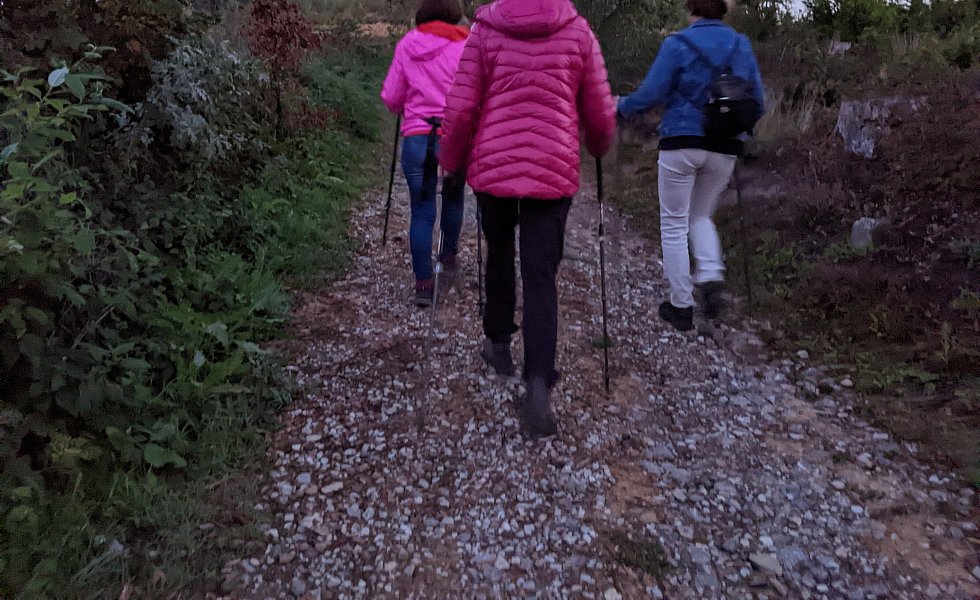 Es geht wieder bergan, die Gespräche werden weniger, die Anstrengung wird mehr. Einem Ehepaar merkt man dies nicht an: „Wir sind heute schon mit dem Fahrrad gekommen“, erzählen beide. Eine Frau ruft überrascht: „Ach Brigitte, du auch hier! Hab’ dich im Dunkeln gar nicht gesehen!“