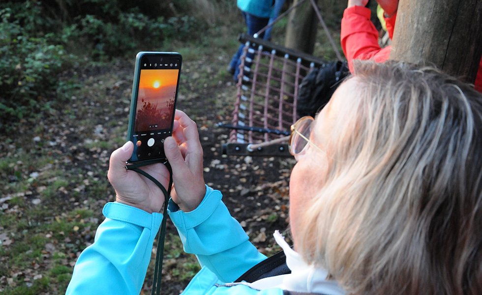 Wir erreichen die Waldschaukel, eine Hängematte oben auf dem Kamm. Schaukeln will niemand, alle haben nur Augen für den Moment, wenn sich die Sonne über den Horizont schiebt. Die beiden Windräder von Werther und die Eichenallee an der Heinrichstraße bieten eine gute Orientierung, wo wir uns befinden. Plötzlich wechseln fast alle aus der Gruppe auf die linke Seite der Lichtung. Und dann weiß ich auch, warum: „Da kommt sie!“