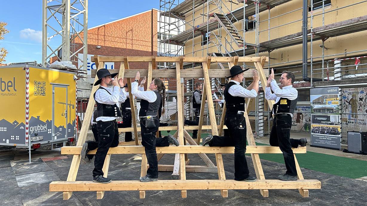 Die Zimmerer der Firma Grübbel führten den traditionellen Zimmererklatsch auf einem sogenannten fliegenden Dachstuhl vor. | © Tobias Barrelmeyer