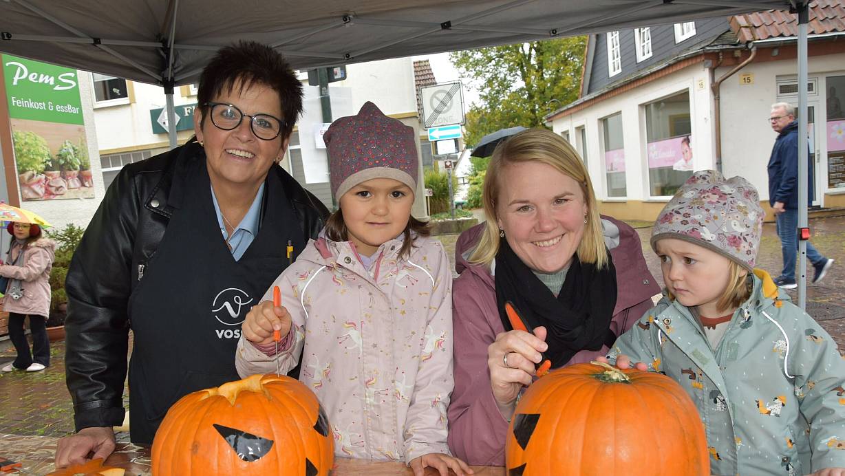 Elisabeth Jebahi von Edeka voss (v. l.) unterstützt Feline, Alana und Amara Medina beim Kürbisschnitzen. | © Birgit Nolte