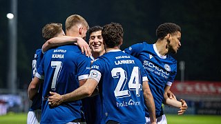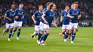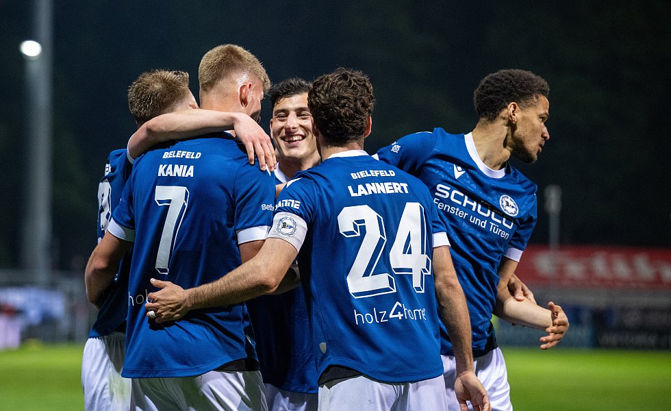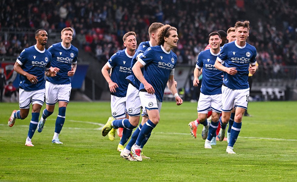 13.04.2025, Fussball, Bundesliga, 33. Spieltag Saison 2024/2025, FC Viktoria Köln - DSC Arminia Bielefeld, Julian Kania (DSC Arminia Bielefeld) freut sich über das Tor zum 0:2 mit der Mannschaft. Foto: Teresa Kroeger