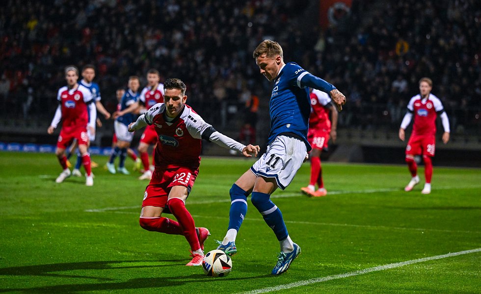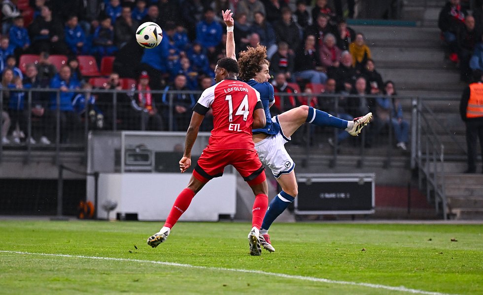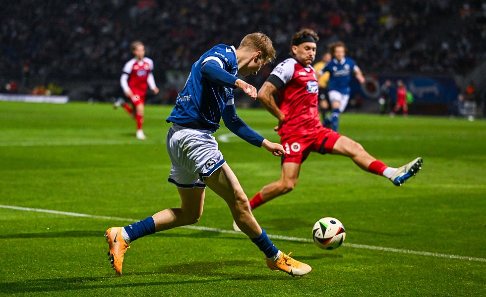 13.04.2025, Fussball, Bundesliga, 33. Spieltag Saison 2024/2025, FC Viktoria Köln - DSC Arminia Bielefeld, Torchance: Louis Oppie (DSC Arminia Bielefeld), Florian Engelhardt (Viktoria Köln) Foto: Teresa Kroeger