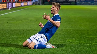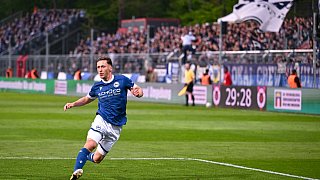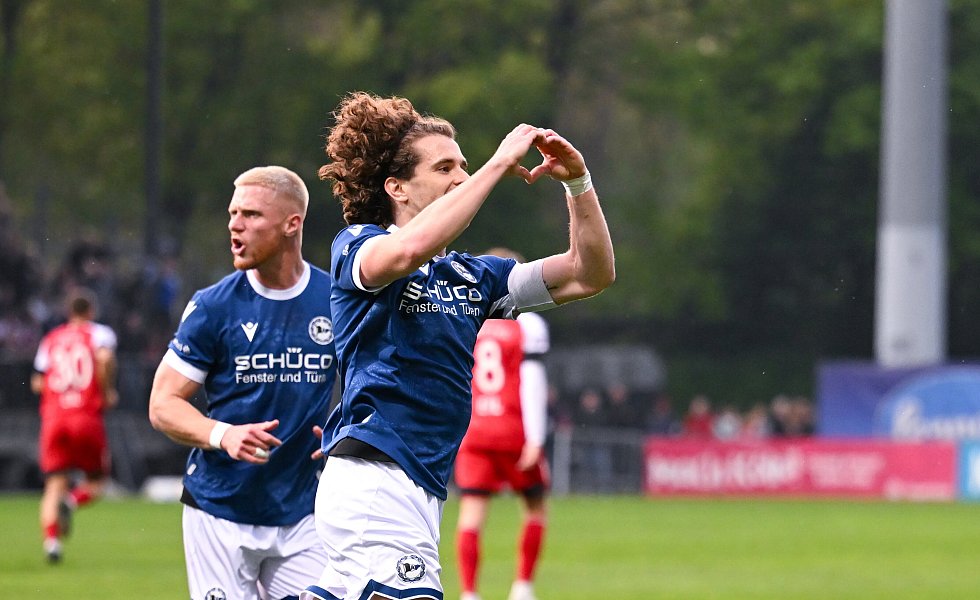 13.04.2025, Fussball, Bundesliga, 33. Spieltag Saison 2024/2025, FC Viktoria Köln - DSC Arminia Bielefeld, Julian Kania (DSC Arminia Bielefeld) freut sich über das Tor zum 0:2, Foto: Teresa Kroeger