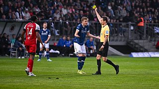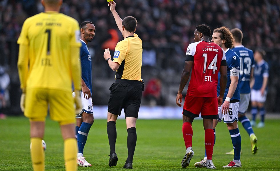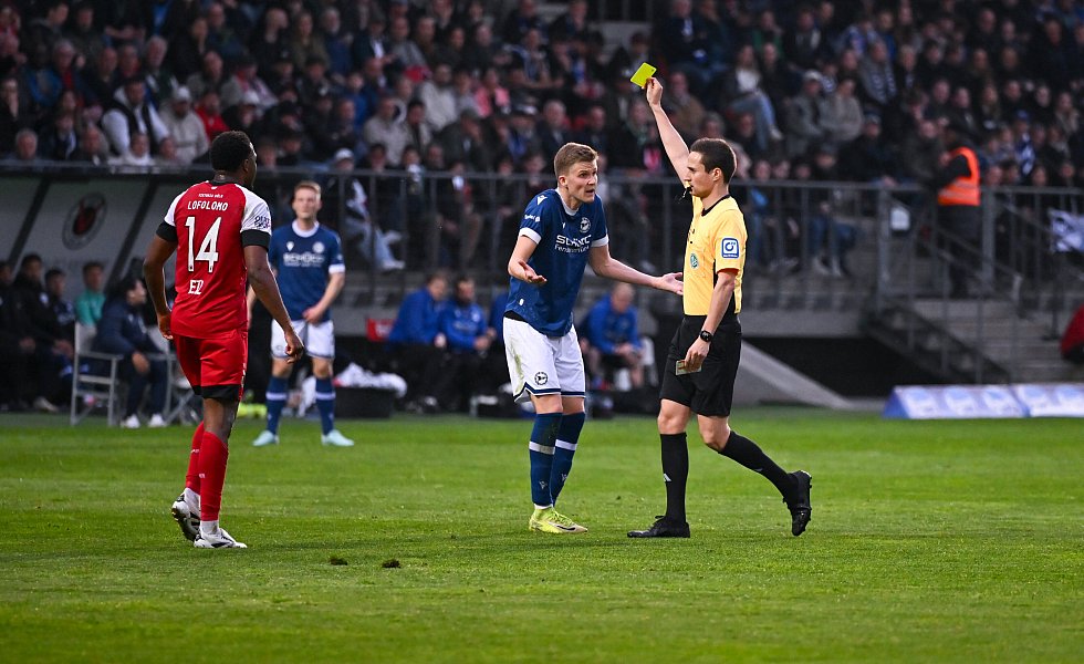 13.04.2025, Fussball, Bundesliga, 33. Spieltag Saison 2024/2025, FC Viktoria Köln - DSC Arminia Bielefeld, Gelbe Karte für Noah Joel Sarenren Bazee (DSC Arminia Bielefeld) Foto: Teresa Kroeger