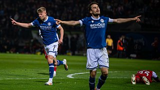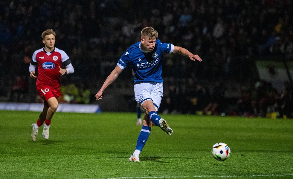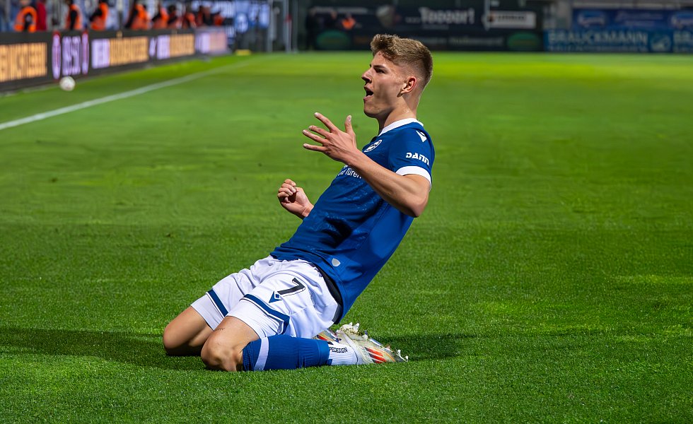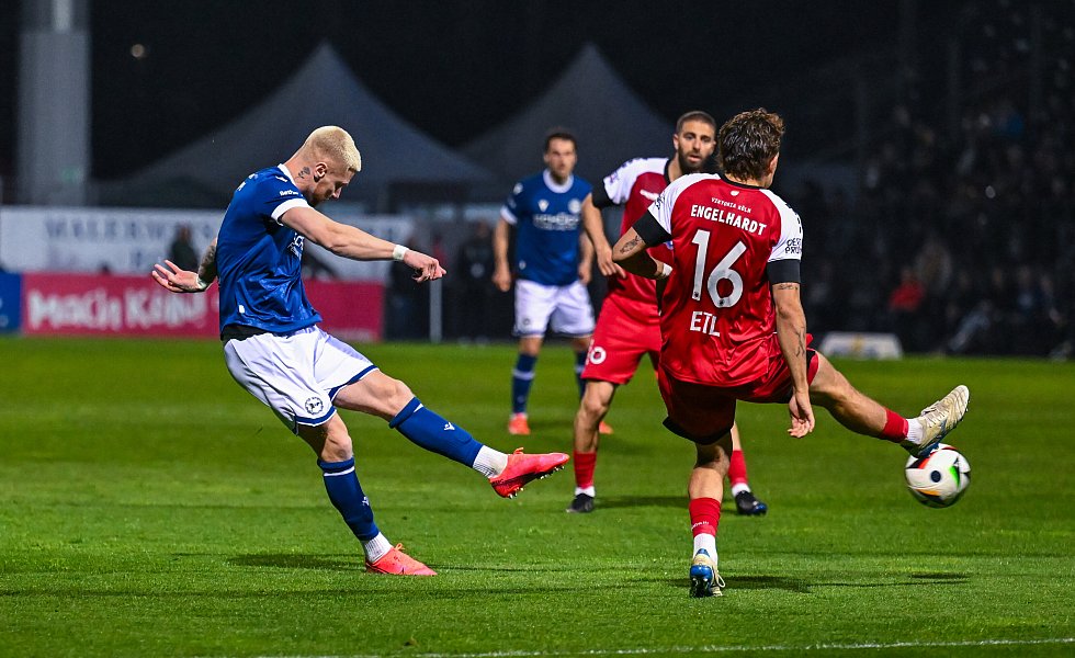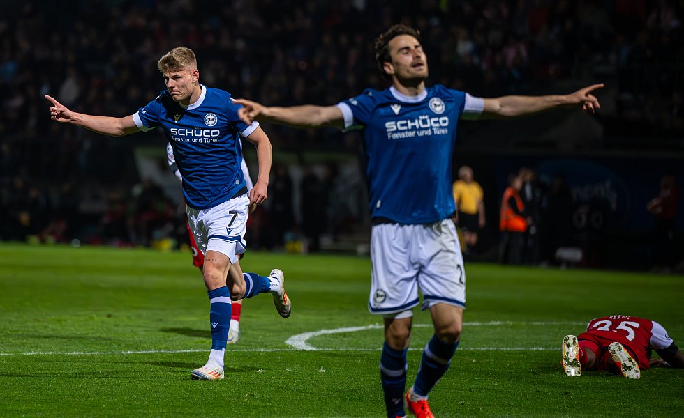 13.04.2025, Fussball, Bundesliga, 33. Spieltag Saison 2024/2025, FC Viktoria Köln - DSC Arminia Bielefeld, Julian Kania (DSC Arminia Bielefeld) erzielt das Tor zum 0:2, Foto: Teresa Kroeger