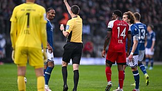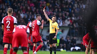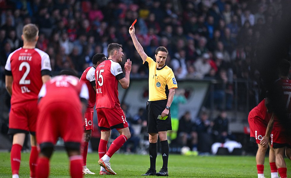 13.04.2025, Fussball, Bundesliga, 33. Spieltag Saison 2024/2025, FC Viktoria Köln - DSC Arminia Bielefeld, Rote Karte für Enrique Lofolomo (Viktoria Köln) Foto: Teresa Kroeger