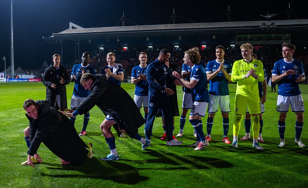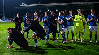 13.04.2025, Fussball, Bundesliga, 33. Spieltag Saison 2024/2025, FC Viktoria Köln - DSC Arminia Bielefeld, Die Spieler von DSC Arminia Bielefeld feiern mit den Fans den Auswärtssieg. Foto: Teresa Kroeger