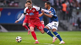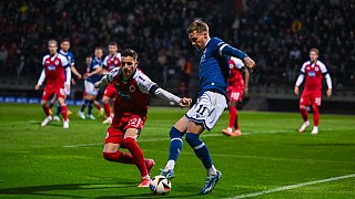 13.04.2025, Fussball, Bundesliga, 33. Spieltag Saison 2024/2025, FC Viktoria Köln - DSC Arminia Bielefeld, Sam Schreck (DSC Arminia Bielefeld), Albion Vrenezi (Viktoria Köln) Foto: Teresa Kroeger