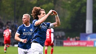 13.04.2025, Fussball, Bundesliga, 33. Spieltag Saison 2024/2025, FC Viktoria Köln - DSC Arminia Bielefeld, Mael Corboz (DSC Arminia Bielefeld) freut sich über das Tor zum 0:1, Foto: Teresa Kroeger