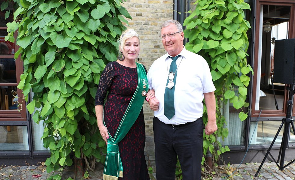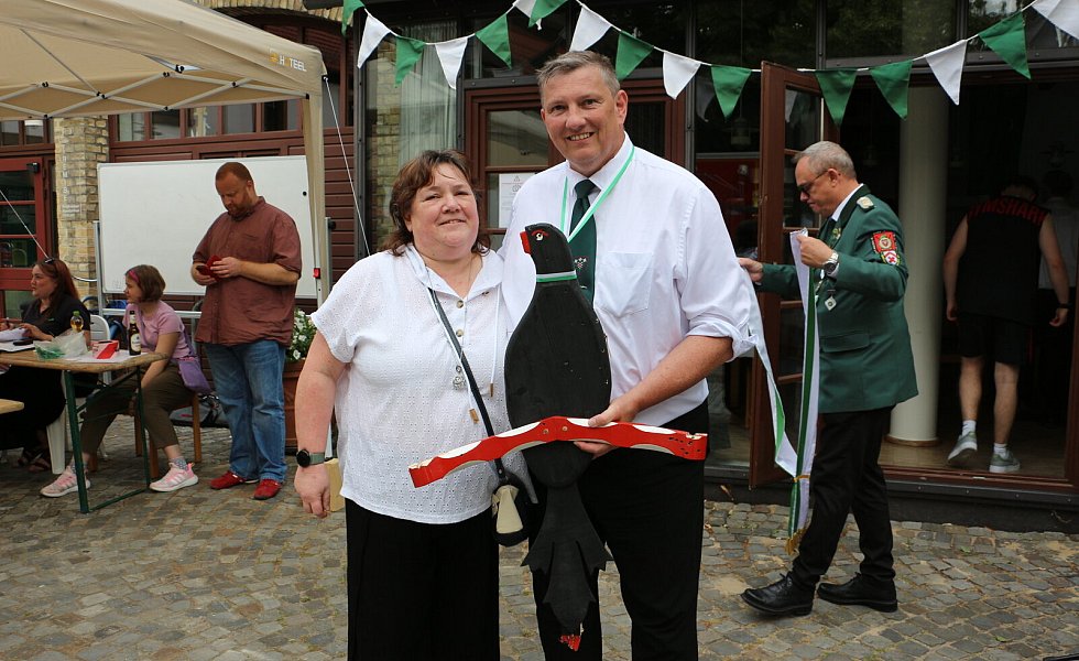 Der neue Schützenkönig zeigt stolz den zerschossenen Adler: Uwe Deppermann (rechts) mit seiner Königin Ulrike.