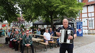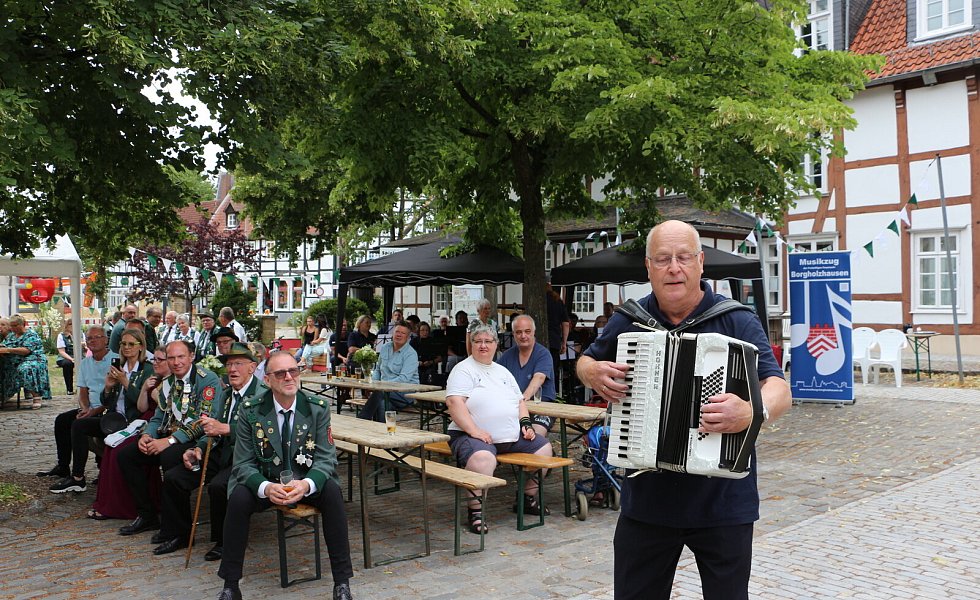 Am Akkordeon überrascht Manfred Lasner (vorne) vom Musikzug Borgholzhausen mit einer musikalischen Extraeinlage.
