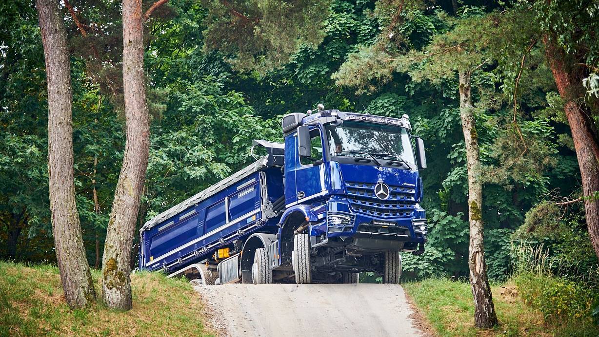 Der Mercedes Arocs 4151 markiert den Auftakt. Die massige Front des Kippladers, das markante Design der Scheinwerfer und der hohe Aufbau der Kabine wirken wie das Gesicht eines Arbeitstiers, das schon alles gesehen hat.