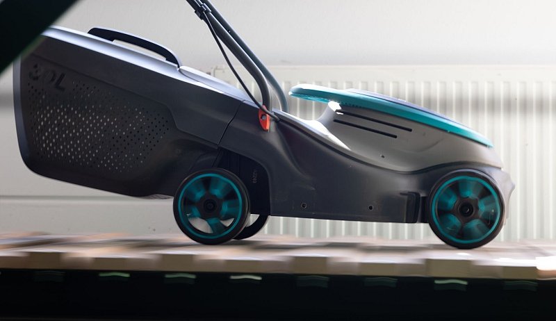 Rasenmäher fahren hier unter anderem über einen genormten Prüfrasen vor einem der Gebäude und werden im Dauertest 100 Stunden über Holzplanken hin und her gezogen – eine rüttelnd-klackernde Monotonie.