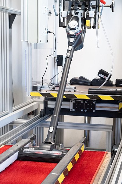 Die Schwellen-Türpfosten-Prüfung zählt ebenfalls zur Untersuchung. In einer Vorrichtung wird der Sauger dafür 10.000 Mal über eine Schwelle gezogen und jeweils 500 Mal rechts und links gegen einen Türpfosten gestoßen. «Das muss er aushalten», sagt Brackemann.
