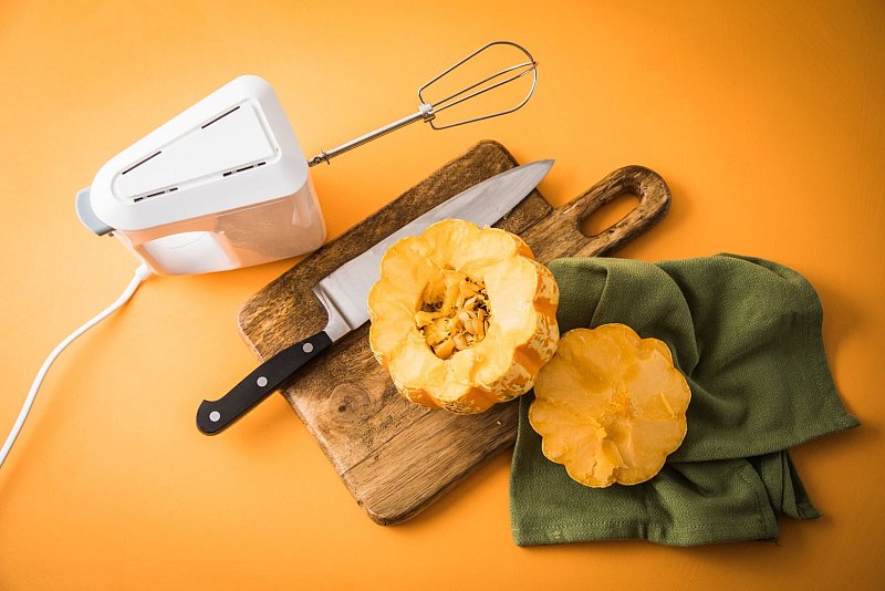 Und so geht’s: Mit einem Messer um den Stiel herum ein ausreichend großes Loch in den ungekochten Kürbis schneiden. Den Handmixer durch das Loch in den Kürbis stecken und einschalten. Mit dem Handrührgerät an der Innenwand des Kürbisses entlanggehen. Nun den Kürbis umdrehen und das lose Fruchtfleisch und die Kerne herausfallen lassen. Den Rest mit einem Löffel abkratzen.