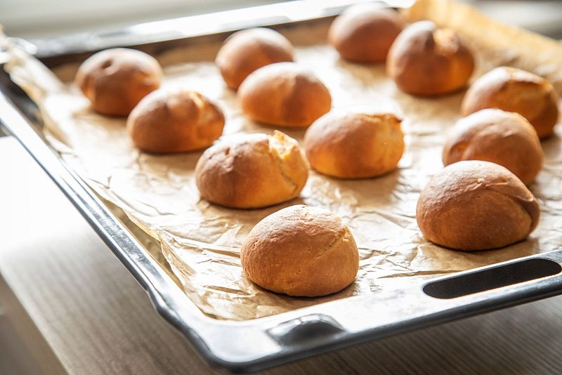 - Am nächsten Tag Teig zu Kugeln à 30-40 g formen, auf ein Blech legen, abdecken und weitere 1 1/2-2 h gehen lassen. Bei 180 Grad (Umluft) 15-18 Minuten goldbraun backen. Auf einem Gitter auskühlen lassen.