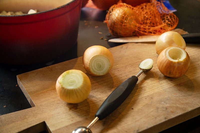 - 4 kleine Zwiebeln mit einem Parisienne-Ausstecher aushöhlen, Schale und äußerste Schicht intakt lassen.