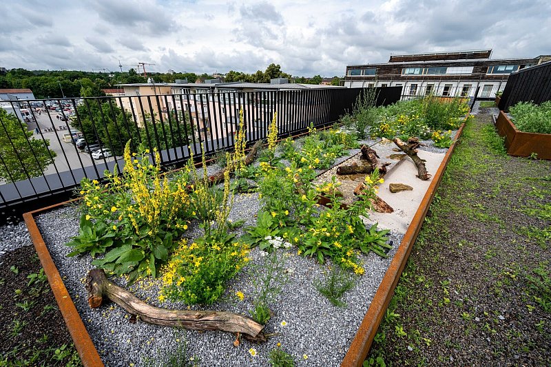Das Dach wird also nur ab und zu betreten. «Geeignet für solche Dächer sind Pflanzen, wie sie auch in Steingärten gedeihen, zum Beispiel Moose, Gräser, Sedum, Mauerpfeffer und Kräuter. Auch seltene Arten, die auf der Roten Liste stehen und sehr attraktiv für Bienen und andere Insekten sind», so Michael Henze.